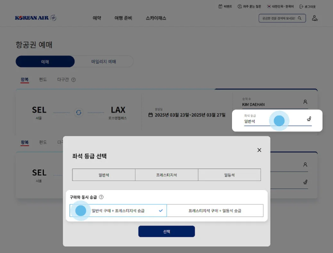 1) 대한항공 홈페이지 항공권 예약에서 좌석 등급 선택 시 구매와 동시 승급을 선택합니다.