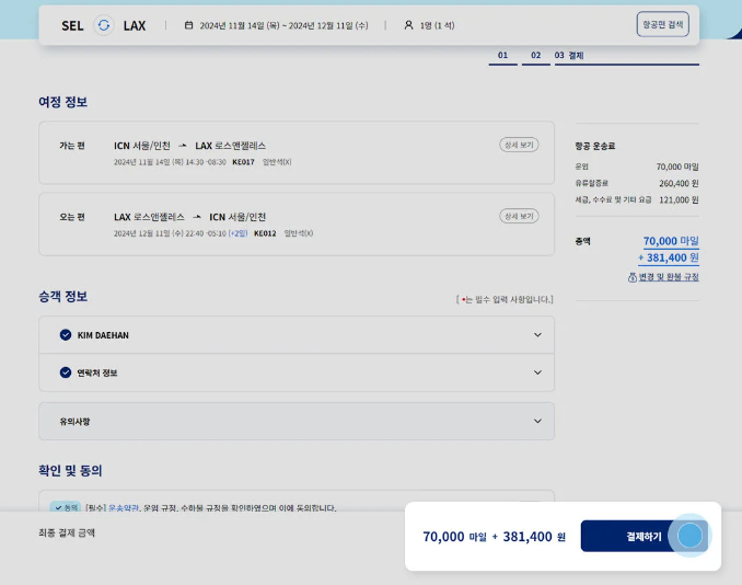 결제 예상금액을 확인 한 후 결제를 진행합니다. 마일리지로 구매할 경우 기본 운임만 마일리지로 구매가 가능하고 유류할증료와 세금 및 수수료는 마일리지 적용이 안되어 실결제를 진행해야 합니다.