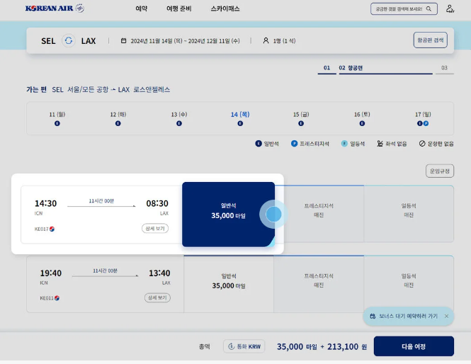 항공편 조회 시 좌석 등급별로 필요한 마일리지와 금액이 함께 조회됩니다. 여기서 원하는 항공편을 선택하여 예약하세요.