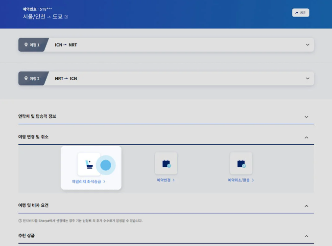 1) 대한항공 홈페이지 나의 여행 조회 > 예약 상세 조회에서 마일리지 좌석 승급을 선택합니다.