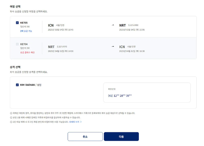 2) 전체 여정 중 좌석 업그레이드를 원하는 구간과 승객을 선택해 주세요. 좌석승급은 추가 비용이 들지 않아 마일리지만 사용하면 승급이 완료됩니다.
